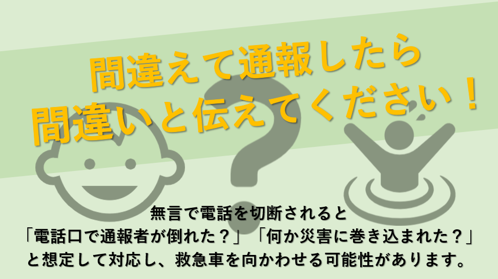 無言で電話を切断されると「電話口で通報者が倒れた?」「何か災害に巻き込まれた?」と最悪の事態を想定し、救急車を向かわせる可能性があります。無言で電話を切断された場合、折り返し電話しますので出てください。また、間違えて通報した場合は、「間違えです。」とお伝えください。